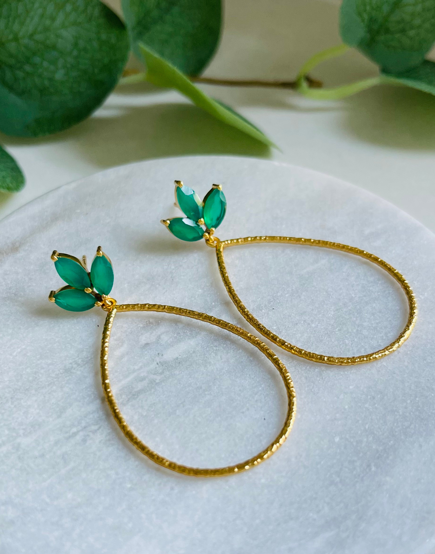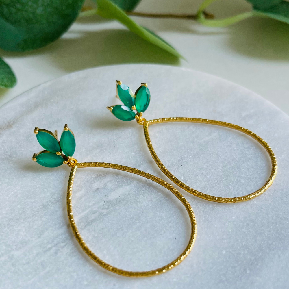 Unusual statement earrings you'll love to create an elegant and cool vibe. These beautiful green onyx gold earrings have a lotus flower style top and a textured 18k gold vermeil loop. These green onyx earrings suit a wide variety of age groups and make a fabulous present for yourself or someone you love!
