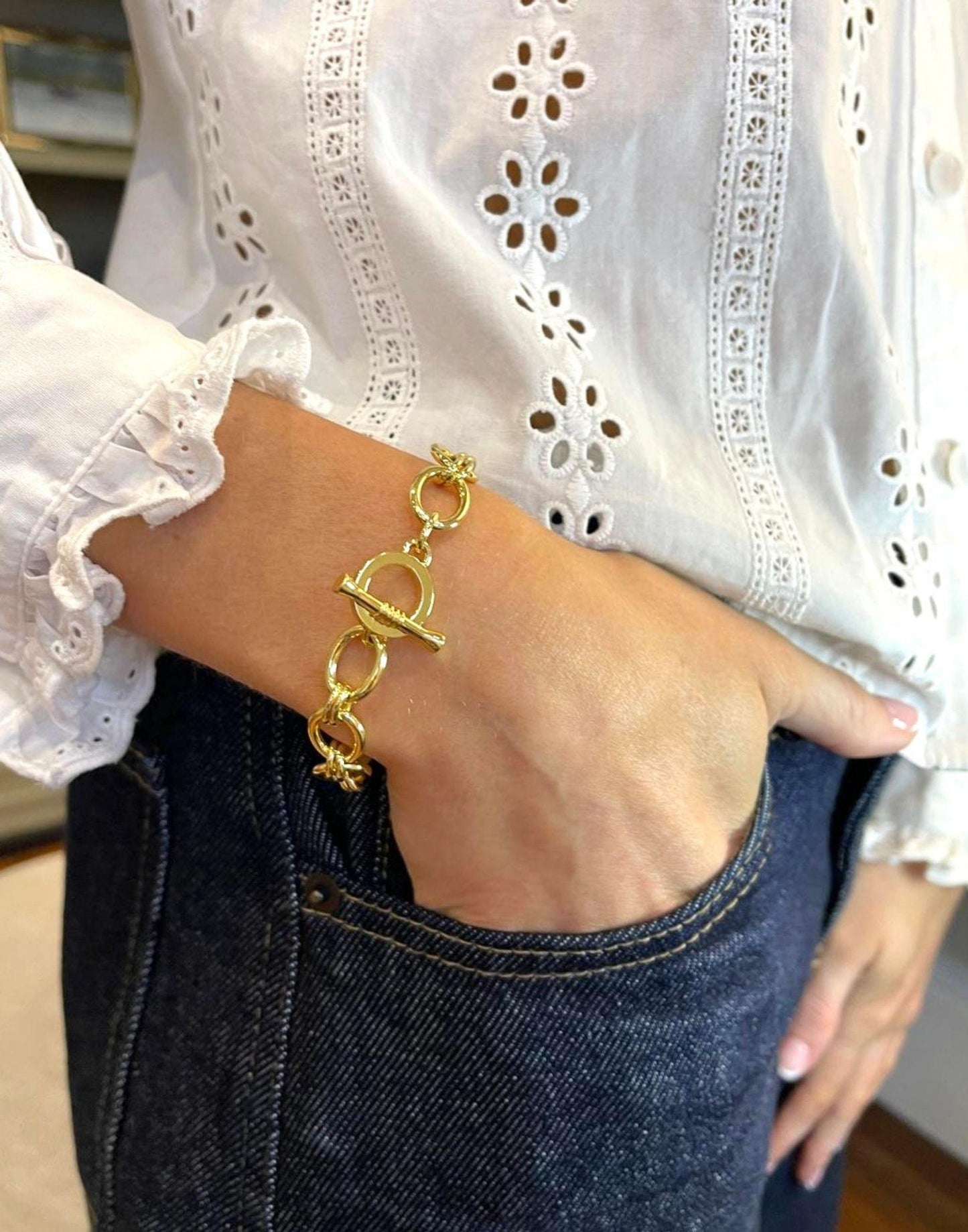 The Lizzy Gold Link Bracelet is not just another bracelet; its elegance in gold. Layer this unusual link design with other accessories to elevate your fashion. You can also rock this beautiful piece solo, with a standard size of approximately 19 cm.